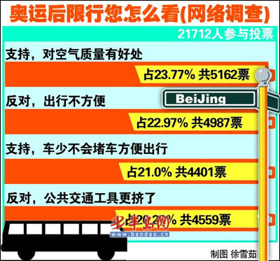 關(guān)于限行措施該不該繼續(xù)執(zhí)行的問(wèn)題,在網(wǎng)上引起了熱議,正方認(rèn)為:從奧運(yùn)限行期間效果來(lái)看,奧運(yùn)限行對(duì)改善北京的空氣質(zhì)量和交通擁擠都有很大的效果,支持奧運(yùn)會(huì)后長(zhǎng)期限行;而反方則認(rèn)為限行對(duì)已經(jīng)買了車的人來(lái)說(shuō)太不方便,如果政府有這方面的打算,就應(yīng)該早出臺(tái)政策,或者有其他相關(guān)政策考慮到有車族。