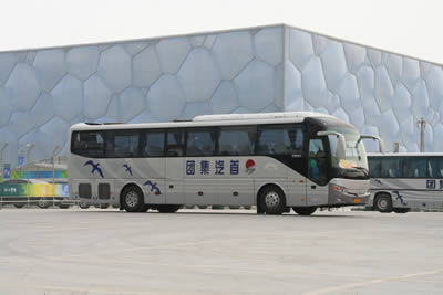 接送境內(nèi)外媒體的奧運(yùn)專用宇通公交車在水立方外