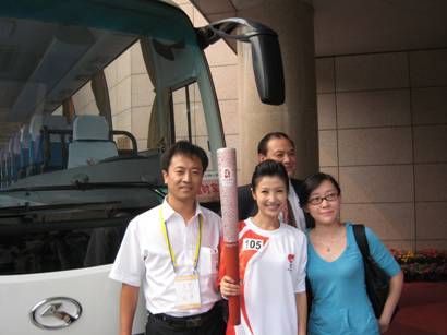 在圣火傳遞中,最富親情的當(dāng)屬第105棒火炬手春妮的夫妻配,春妮是北京電視臺(tái)的主持人,她和丈夫蔣虎分享了當(dāng)天的傳遞路程,夫妻倆人聯(lián)手高舉 “ 祥云 ” ,面帶笑意,將幸福和溫馨的情感傳遞給在場(chǎng)的每一個(gè)人。為了紀(jì)念這一人生的特別時(shí)刻,專門為火炬手服務(wù)的一位海格客車司機(jī)楊洪在征得春妮同意后,有幸在自己的大巴前同她合影。