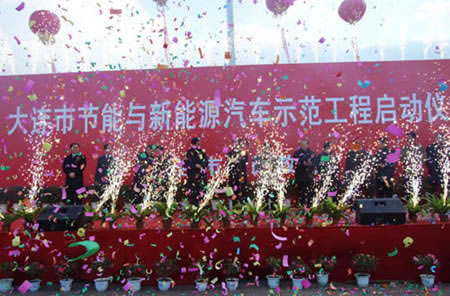 12月18日下午,在大連市人民廣場,隨著大連市委書記張成寅一聲令下,大連市節(jié)能與新能源汽車示范工程全面啟動,一汽集團提供的12輛混合動力客車正式投放大連市15路公交客運線路運行。全國政協(xié)副主席、科技部部長萬鋼發(fā)來賀信。出席儀式的領(lǐng)導(dǎo)還有大連市市長夏德仁、一汽集團公司黨委書記趙方寬、長春市副市長肖萬民等。