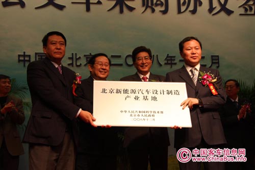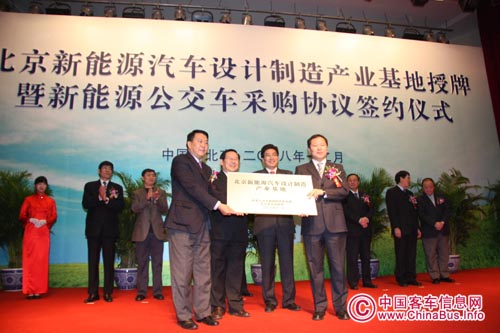2008年12月28日,北京新能源汽車設(shè)計制造產(chǎn)業(yè)基地授牌暨新能源公交車采購協(xié)議簽約儀式在福田汽車舉行,國家科技部和北京市政府聯(lián)合向福田汽車授予了北京新能源汽車設(shè)計制造產(chǎn)業(yè)基地牌匾,全國政協(xié)副主席、科技部部長萬鋼,北京市市長郭金龍等領(lǐng)導(dǎo)出席儀式。
