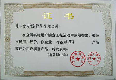 在2008年歲末之際,廈門金旅再添殊榮——全國用戶滿意產(chǎn)品。該稱號系中國質(zhì)量協(xié)會為促進我國產(chǎn)品、建筑工程、服務(wù)質(zhì)量和企業(yè)市場競爭力提高,在全國范圍開展的用戶滿意測評工作。據(jù)悉,廈門金旅不僅是廈門惟一一家獲此榮譽的企業(yè),同時也是整個客車行業(yè)惟一一家獲此榮譽的客車品牌!