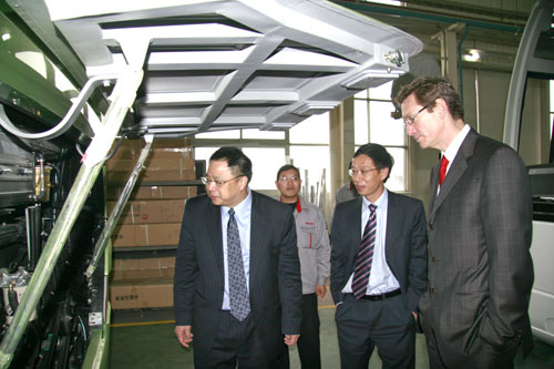 蘭博文一行還參觀了公司裝配車間、底盤車間、總裝車間及豪華車生產(chǎn)線,并試乘了裝配有康明斯發(fā)動機(jī)的出口樣車。