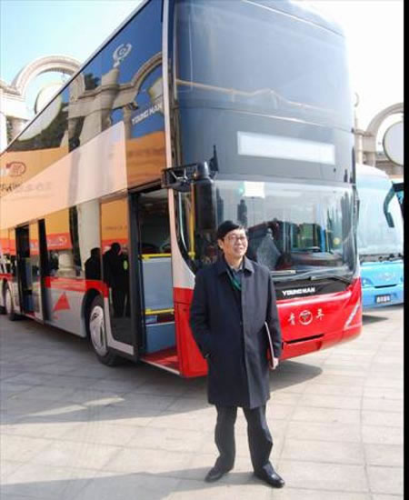 城市車輛專家委員會(huì)主任李世豪在青年雙層公交車前拍照留念