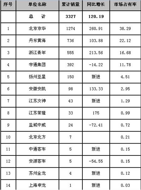 2008年,特大型客車共計銷售3327輛,同比增長120.19%,在客車市場上表現(xiàn)出良好的增長勢頭。具體的銷量情況見表1,共涉及到14家客車企業(yè),除新進入企業(yè)外,只有三家企業(yè)表現(xiàn)低迷,其他企業(yè)同比增長均在100%以上。