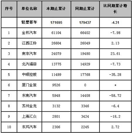 輕型客車整體市場表現(xiàn)較差,全年累計銷量比同期下降4.31%,銷量排在前十位的企業(yè)中(見表2),大多數(shù)企業(yè)處于下降狀態(tài)。