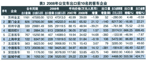 1.2008年共有23家客車企業(yè)參與了公交客車出口業(yè)務(wù),共銷售公交車5363輛,比2007年的5241輛多銷售122輛,增長率為2.33%,遠(yuǎn)遠(yuǎn)高于2008年客車整體出口數(shù)量-20.94%的增長率。出口額為211137.89萬元人民幣,比2007年多32004.41萬元人民幣,增長率為17.87%,也遠(yuǎn)遠(yuǎn)高于2008年客車出口額整體5.52%的增長幅度;單臺平均價格為39.37萬元人民幣,比2007年的34.18萬元人民幣升高了5.19萬元人民幣。說明2008年中國客車企業(yè)在公交車出口業(yè)務(wù)方面是全方位的增長,而且出口產(chǎn)品的檔次越來越高了,說明公交車出口已經(jīng)成為2008年中國客車出口業(yè)務(wù)的重要力量,也是遏制中國客車出口業(yè)務(wù)下降的重要因素。