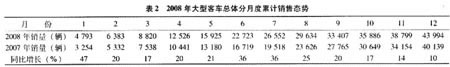 2008年大型客車總體(含非完整車輛)市場(chǎng)分月度和累計(jì)銷售態(tài)勢(shì)見表1、表2,主要生產(chǎn)企業(yè)銷量及市場(chǎng)份額見表3。