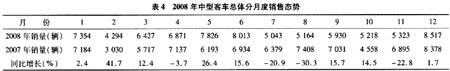 2008年中型客車總體(含非完整車輛)市場(chǎng)分月度和累計(jì)銷售態(tài)勢(shì)見表4、表5,主要生產(chǎn)企業(yè)銷量及市場(chǎng)份額見表6。