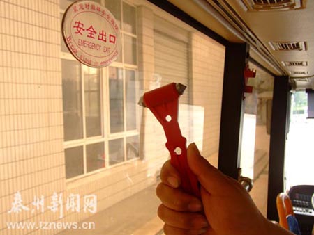 車牌為蘇M05008的“泰州―南京”的車上,司機陳師傅說,他們車上應(yīng)配4把安全錘,后面兩把丟了。