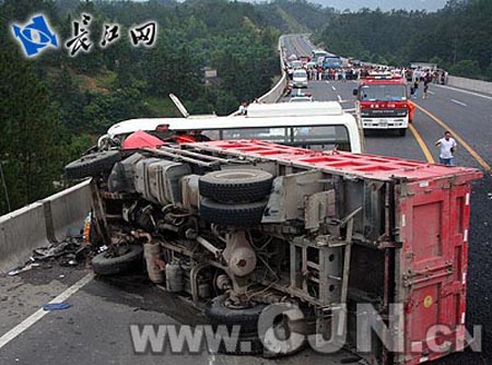 7月9日晚18時30分左右,武漢市恩施市金桂大道滬蓉西高速公路連接線處發(fā)生一起重大交通事故,一輛車牌號為鄂Q12397的東風(fēng)牌大貨車在運(yùn)輸瀝青途中不慎發(fā)生側(cè)翻,正好撞上迎面駛來的一輛車牌號為鄂Q12933的東風(fēng)時尚客運(yùn)車,造成客車上多名乘客及司機(jī)被困。18時33分,恩施市消防大隊接到群眾報警后,迅速調(diào)集16名官兵,并出動一臺搶險救援車和一臺水罐車火速趕赴現(xiàn)場救援。