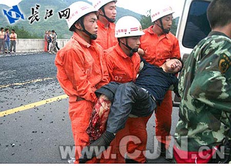 在事故現(xiàn)場,發(fā)生側(cè)翻的大貨車橫臥在路邊,車上運(yùn)輸?shù)臑r青散落的滿地都是,車上3名司乘人員不同程度的受傷。貨車車頭與客車車頭緊緊咬合在一起,客車上39名乘客全部受傷。據(jù)現(xiàn)場目擊者說,部分受傷較輕的乘客已經(jīng)被交送往醫(yī)院救治。由于被撞客車嚴(yán)重變形,車上仍有12名乘客被困,身體或多或少車體卡住,并不同程度受傷,1名坐在發(fā)動機(jī)蓋上20多歲的姑娘一頭撞到車窗上,奄奄一息傷勢很重。散落滿地的瀝青、部分車子零件和碎玻璃,現(xiàn)場一片狼籍。