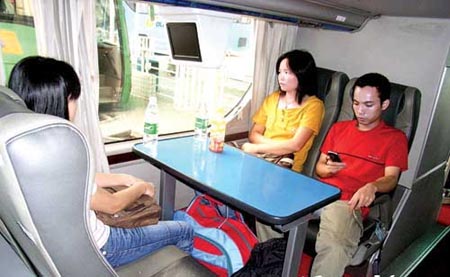 車內(nèi)有冰箱、微波爐,可供乘客存放或加熱食物。當(dāng)車價(jià)達(dá)300萬元的一款豪華大巴現(xiàn)身滘口汽車站。 記者看到,這臺(tái)“神舟號(hào)”大巴長(zhǎng)13.7米,分上、下兩層:上層乘客區(qū)共設(shè)有40個(gè)航空座椅,4臺(tái)可翻折的液晶電視循環(huán)播放電影;下層為豪華商務(wù)艙,共21個(gè)座位,配有8臺(tái)液晶小電視、空調(diào)出風(fēng)調(diào)節(jié)器、閱讀照明燈、直飲水機(jī)、微波爐、餐桌、冰箱等,車廂尾部還設(shè)有一間袖珍式的衛(wèi)生間。這些設(shè)施都是免費(fèi)使用。坐在車內(nèi),還真有坐飛機(jī)的感覺。
