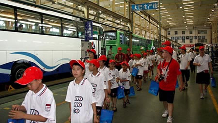 小朋友們排隊參觀大巴生產(chǎn)線