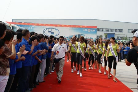 8月25日9時,2009國際旅游小姐車隊抵達制造二部,在熱烈的歡迎氛圍中,60余名國際佳麗款款下車,踏上紅地毯,走進少林客車。精心的布置、隆重的場面、熱情的人群讓佳麗們步入少林客車的一瞬間,就被少林人的真摯熱忱感動,不時向兩旁的歡迎人群揮手致意。