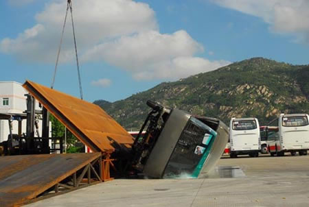 8月17日下午,在廈門金旅公司海滄試驗場上傳來一片歡呼聲,在技術中心、中客一部等相關部門的配合下,該公司生產(chǎn)的右舵考斯特車身在側翻試驗中,取得試驗數(shù)據(jù)合格的成績。讓人感到意外的是,樣車除右側(不接觸地面的一側)所有的車窗玻璃均完好無損外,左側觸地面處居然有一塊長1470mm,高835mm的玻璃也保持原樣,這一試驗結果不僅為金旅公司出口部下一階段工作的順利進行打下了堅實的基礎,更為金旅客車順利進軍澳洲市場打開了通關大門。