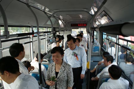 據(jù)悉,這批新能源車是中通客車專門設(shè)計研發(fā)的一款油電混合動力城市客車,車長12米,排放標準達到國Ⅳ標準,是國家十一五“863”計劃先進能源技術(shù)新型示范車。車輛在安全性能、駕駛操縱性能、人性化設(shè)計等方面都有較大的改進,特別是安全性性能,增加了乘客門的內(nèi)外應急開關(guān)和機械總開關(guān),車輛的應急能力有了較大的提高,ABS系統(tǒng)提高了車輛的制動性能。電控自動變速箱大大降低了駕駛員的勞動強度。鋁合金扶手加防寒膠套、乘坐舒適的軟座、LED顯示屏、車內(nèi)移動電視等無不體現(xiàn)了人性化的設(shè)計理念。濟南市在全運會期間大規(guī)模示范使用節(jié)能與新能源汽車,不僅充分體現(xiàn)“科技全運、綠色全運”的主題,而且對推動我國節(jié)能與新能源汽車產(chǎn)業(yè)具有重要意義。