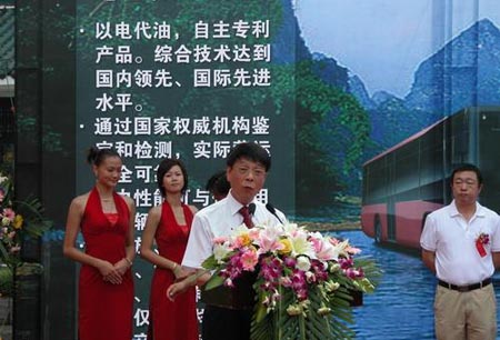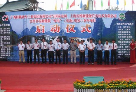 2009年9月18日上午10:18,桂林客車工業(yè)集團(tuán)新能源“雙電”(電池+電容)純電動(dòng)客車項(xiàng)目啟動(dòng)儀式在風(fēng)景如畫的桂林市舉行。國家電網(wǎng)、上海市經(jīng)委、上海銘源集團(tuán)、上海雷博公司、桂客集團(tuán)領(lǐng)導(dǎo)、上海市、廣西區(qū)、桂林市相關(guān)部門和媒體等共同見證了這一歷史時(shí)刻;隨著桂林市長(zhǎng)李志剛先生宣布項(xiàng)目啟動(dòng),主席臺(tái)上所有嘉賓為新能源“雙電”純電動(dòng)客車舉行了揭幕儀式,之后,各嘉賓們乘車感受“雙電客車”的優(yōu)異性能。
