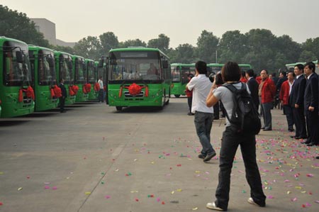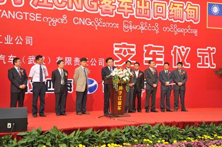 16日,出口緬甸的50輛揚子江WG6110N型CNG公交車,在武漢公交三公司舉行了隆重的交接車儀式,緬甸駐華使館助理蔭芒森、武漢市人民政府副市長尹維真、中國北方工業(yè)公司副總裁羅開全、武漢市硚口區(qū)副區(qū)長程宏剛、武漢市交通委員會主任彭俊、武漢市商務(wù)局副局長鄒衛(wèi)東、湖北省商務(wù)廳陳處長、武漢市公共交通集團有限責(zé)任公司董事長遲旭東、東風(fēng)揚子江汽車(武漢)有限責(zé)任公司董事長黃文芳、總經(jīng)理黃修瑞等應(yīng)邀請出席了儀式。