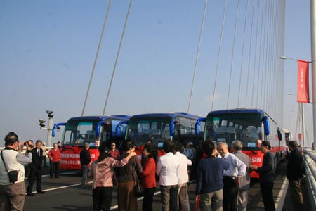 10月31日6:00,6臺出席通車儀式的海格6116TE3大巴披紅掛彩,來到江南造船集團(tuán)公司的家屬區(qū),等候著近兩百名江南造船廠離退休員工代表上車。原來,擁有145年歷史的江南造船廠2008年從浦東半淞園路全部搬遷到了上海與崇明島之間的長興島,為了接送員工上下班,需要大批的通勤車輛。經(jīng)過精心的挑選,安全、舒適、亮麗的海格客車成為他們的首選。為了讓江南造船廠老一輩功臣建設(shè)者們第一時間感受長江隧橋開通帶來的巨大變化,江南造船廠的領(lǐng)導(dǎo)決定用剛提回來的海格客車載著他們參加長江隧橋通車儀式。