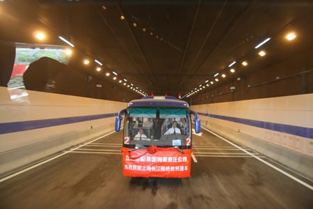 浩浩蕩蕩的海格車隊6:40開始出發(fā),迎著朝陽平穩(wěn)行駛在上海的高架道路上沒多久就來到了長江隧道。長約8.9公里的隧道高大寬敞。據(jù)介紹隧道分為三層:頂部是排煙道,中部高速公路層,可通行5米高的車輛;下部為預(yù)留軌道交通空間,將來有條件可開通城市軌道交通。該隧道外徑達(dá)15米,是目前世界上最大直徑的隧道。伴著嗖嗖的風(fēng)聲,海格車隊也完成了長江隧道的首次穿越。
