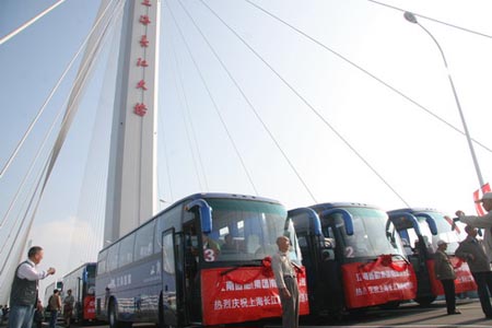 9:30分,隨著典禮上齊鳴的禮炮、升空的禮花和氣球,歡樂的人群開始涌動,上海長江隧橋通車儀仗車隊在彩車的引領(lǐng)下浩浩蕩蕩通過長江第一橋。海格客車在觀眾和中央、上海眾多媒體的注目下,勝利地完成了這次跨越。
