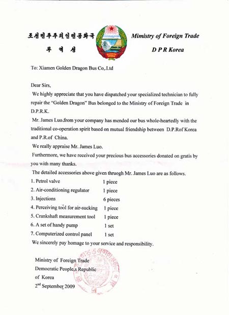 然而好事多磨,由于朝鮮方面遲遲不能辦出邀請(qǐng)函,時(shí)間上金旅一等再等,一直到今年9月初還未能成行,金旅已接受任務(wù)的技師也因此事不斷地在調(diào)整工作計(jì)劃,避免工作時(shí)間的沖突。期間,出于金旅人的責(zé)任感和誠(chéng)意,金旅幾次催促經(jīng)銷(xiāo)商聯(lián)系朝鮮客戶(hù)盡快辦理邀請(qǐng)函,終于在9月20日順利成行并很好地解決了車(chē)輛故障。朝方對(duì)金旅及時(shí)有效的解決非常滿(mǎn)意,安排朝鮮國(guó)家貿(mào)易省官員接見(jiàn),并致以感謝信一封。