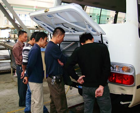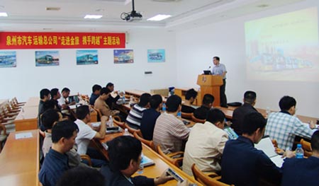 2009年11月4日,泉州市汽車運(yùn)輸總公司林思敏副總經(jīng)理、機(jī)務(wù)部陳聰坤主任等領(lǐng)導(dǎo)攜其維修部的一線員工共22人走進(jìn)金旅,開始了對(duì)廈門金旅為期兩天的參觀訪問?!按舜蝸斫鹇?,主要是想讓我們的一線員工了解客車生產(chǎn)線的裝配過程,了解金旅的售后服務(wù)體系,以及通過對(duì)新型客車結(jié)構(gòu)的認(rèn)識(shí),提高一線人員業(yè)務(wù)水平。”泉州汽運(yùn)公司陳主任說。