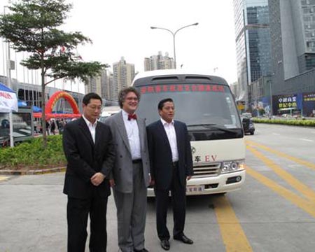 斯蒂芬·波特蘭與王江安董事長(zhǎng)在安凱寶斯通車前合影