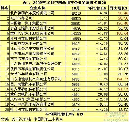 去年10月,中國商用車銷量前10企業(yè)為北汽福田、東風、一汽、江淮、金杯、中國重汽、長安 、江鈴、陜汽和力帆,而今年10月的前10不僅多了山東凱馬、南汽這兩個有輕卡(在汽車下鄉(xiāng)政策覆蓋面內)業(yè)務的企業(yè),少了陜汽等,而且長安的排名由去年的第7位升至第5位,從中都可看到汽車下鄉(xiāng)政策的影響。