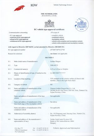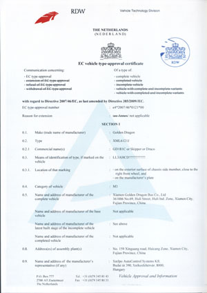 2009年金旅客車又為中國客車開創(chuàng)了先河,金旅XML6937旅游客車、XML6121城際客車順利通過歐盟WVTA證書,標(biāo)志著這兩款中國客車成功敲開了歐洲的大門,今后可以在歐盟各國間自由銷售,金旅客車也成為了中國首個(gè)由生產(chǎn)廠商直接申請并獲得歐盟整車認(rèn)證的客車企業(yè)。