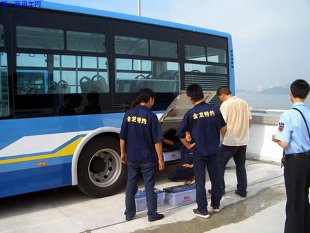 金龍?zhí)丶s站服務(wù)人員在檢修保養(yǎng)車輛