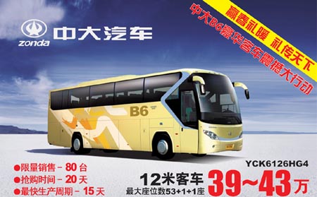 2010年1月10日至31日期間,中大汽車特選80臺(tái)B6系列豪華客車回饋廣大用戶,最大優(yōu)惠可達(dá)20%。此次活動(dòng)的主導(dǎo)車型為中大汽車B6系列YCK6126HG4。該車作為中大汽車經(jīng)典系列車型,采用承載式車身設(shè)計(jì),精選成熟可靠總成,配備貫通式超大行李倉,最大座位53+1+1,同時(shí)采用流線型車身,使得整車動(dòng)感十足,散發(fā)著時(shí)代氣息,給予駕乘者尊貴暢快的駕乘享受。YCK6126HG4自投入市場以來,市場反應(yīng)良好,運(yùn)行性能優(yōu)異,是確保廣大旅客安全、及時(shí)出行的交通工具,更是客運(yùn)、旅游營運(yùn)者的理想工具。