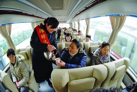 1月12日上午,濰坊至濟(jì)南首條豪華客運(yùn)專線開通,跑完全程200公里只需2小時(shí)30分鐘左右。該班線所有營(yíng)運(yùn)客車都是尼奧普蘭高二級(jí)豪華客車,座椅從47座刪減到34個(gè),并且全是可調(diào)式航空坐椅,舒適程度堪比動(dòng)車,而票價(jià)僅55元,大約每45分鐘一班,時(shí)間也比以前縮短了半個(gè)小時(shí)。當(dāng)日,首次開跑的豪華客車票賣得非常好,超出車站的預(yù)料。有關(guān)人士表示,動(dòng)車組列車開行以來,“公鐵賽跑”使濰坊城區(qū)兩大汽車站濟(jì)南方向的乘客數(shù)量減少三成以上,此次首條豪華客運(yùn)專線的開通有望將濰坊公路客運(yùn)帶進(jìn)豪華客車時(shí)代。