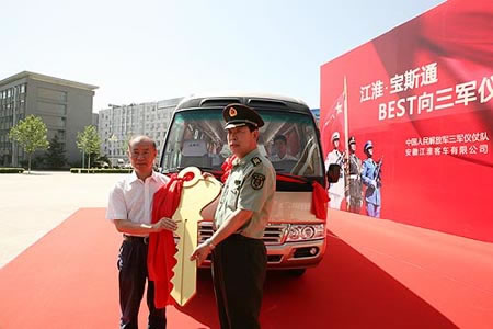 2009年6月28日,江淮·寶斯通公務(wù)商務(wù)客車正式成為中國(guó)人民解放軍陸??杖妰x仗隊(duì)用車。江淮汽車集團(tuán)董事長(zhǎng)左延安向三軍儀仗隊(duì)大隊(duì)長(zhǎng)劉士偦大校贈(zèng)送了江淮·寶斯通客車(VIP車型)鑰匙。
