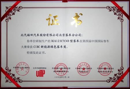 2009年2月28日至3月2日,以“綠色•新能源•節(jié)能”為主題的第七屆北京國際客車及零部件展覽會在北京展覽館隆重舉行,迎亞運 迎大運廣東客車運營企業(yè)車輛選型活動同期舉行。業(yè)內(nèi)專家、公交公司代表評審團(tuán)及廣東省城市公交協(xié)會專家對參展的整車及零部件產(chǎn)品進(jìn)行了嚴(yán)格評審,28日晚,第四屆中國國際客車大賽頒獎晚會在京舉行,北汽福田歐V客車喜獲“CIBC 節(jié)能環(huán)保公共汽車獎”、“CIBC 新能源綠色客車獎”、“迎亞運 迎大運優(yōu)秀客車供應(yīng)商獎”和“迎亞運 迎大運最佳車型獎”四項大獎。