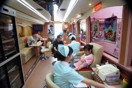 義務(wù)獻血者在大金龍房車型獻血車前排起了長龍