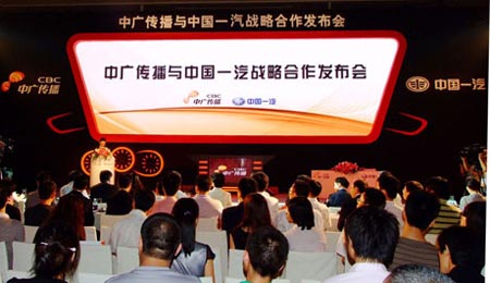 6月29日,中國一汽與中廣傳播在北京聯(lián)合召開新聞發(fā)布會,簽署戰(zhàn)略合作協(xié)議,這是移動多媒體廣播電視技術(shù)在汽車制造領(lǐng)域第一次全面應(yīng)用,是汽車產(chǎn)業(yè)與廣電產(chǎn)業(yè)強強聯(lián)合,推動創(chuàng)新發(fā)展的重要舉措,具有十分重要的戰(zhàn)略意義。雙方的戰(zhàn)略合作,必將充分發(fā)揮兩大產(chǎn)業(yè)集團的優(yōu)勢,開創(chuàng)攜手共贏發(fā)展的新局面。