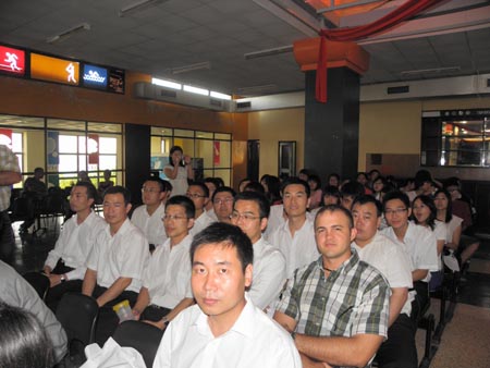 兩天后的開學(xué)典禮上,宇通人再次成為焦點(diǎn)。全系共有500多名學(xué)生,有的是在校大學(xué)生,有的是公派出國人士,有的是企業(yè)進(jìn)修員工。有個(gè)人單獨(dú)求學(xué),也有集體外派的,而那一天,10名宇通人統(tǒng)一著宇通白色襯衣,藍(lán)色褲子和黑色皮鞋,意氣風(fēng)發(fā)地走進(jìn)會(huì)場,讓他們?cè)谛涡紊娜巳豪镌俅伪蝗俗⒛俊榱诉@首次的亮相,頭天晚上,他們從著裝到動(dòng)作,從發(fā)言到神態(tài)都經(jīng)過了小組討論,為的是展現(xiàn)在當(dāng)?shù)仡H具名氣的宇通人風(fēng)采。根據(jù)學(xué)生順序,他們10個(gè)人被編在34班。格外響亮的掌聲,讓34班一舉成名。
