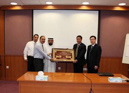 阿聯(lián)酋校車(chē)公司及廈門(mén)金旅公司領(lǐng)導(dǎo)在校車(chē)前合影