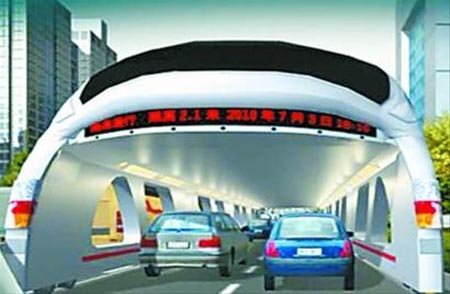電腦模擬路面效果顯示,快巴在行駛時就如同公路上移動的隧道一樣,小汽車在其下層兩個車道通過,兩者互不干擾,避免了現(xiàn)在公交車和小汽車爭道的情況。