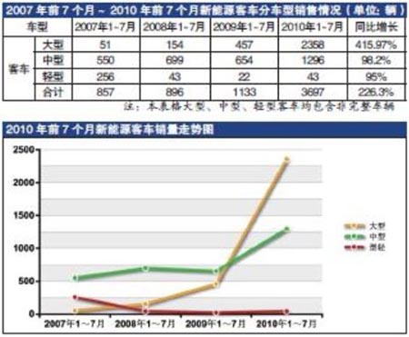2010年前7個月,新能源客車共銷售3819輛,占據(jù)新能源商用車總銷量的98%以上。而新能源卡車銷售39輛,主要以天然氣為主。從月度銷量走勢看,4月和5月是新能源客車銷量集中的月份,均在600輛以上。從具體車型來看,大、中型客車仍然是新能源汽車商業(yè)化的主要力量,這部分車輛主要投放到城市公交線路運行,這主要是因為城市公交車在行駛過程中起停頻繁,對速度要求不高,具有良好的示范效應,而且主要買家為政府和事業(yè)單位,在政策推動下有望率先實現(xiàn)產(chǎn)業(yè)化。