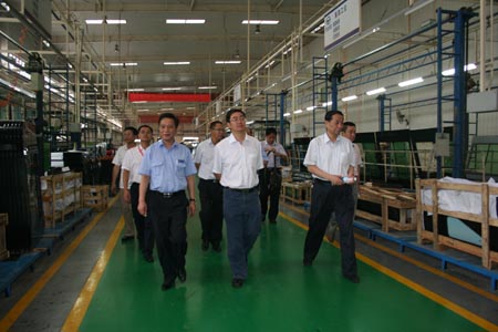 恒通客車董事楊茂超(右一)、總經(jīng)理羅邦初(左一)陪同李俊市長(中)一行在總裝車間參觀