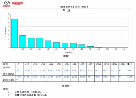 從下列圖表分析,可發(fā)現(xiàn)王師傅駕駛的車輛運行低速區(qū)域較多,平均車速偏低,這是因為國道路況復(fù)雜所致;同時,根據(jù)發(fā)動機轉(zhuǎn)速圖表分析,小于800轉(zhuǎn)/分鐘的比例占到了33%,而在經(jīng)濟轉(zhuǎn)速的區(qū)域相對較少,如果減少車輛怠速時間,提高經(jīng)濟轉(zhuǎn)速比例便可以有效降低油耗。