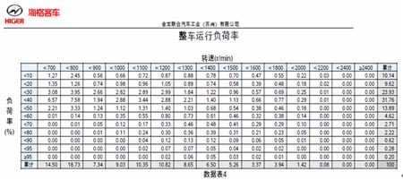 從整車運行負荷率圖上可看到,該車輛低負荷率占比太高,同時在發(fā)動機的非經(jīng)濟轉(zhuǎn)速區(qū)域內(nèi)的的低負荷率占較高,如果提高整車的負荷率特別是提高經(jīng)濟轉(zhuǎn)速區(qū)域內(nèi)的負荷率亦可以有效降低油耗。