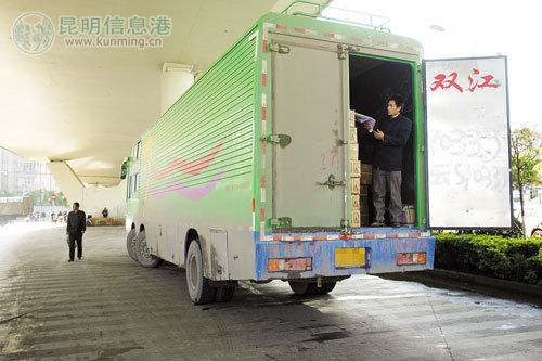 記者趕到官南路時,張先生所說的“大客車”正在卸貨。遠遠看去,這輛車和長途大客車一樣,尤其是車頭,和客車完全一樣。在車前擋風(fēng)玻璃上貼著“昆明至雙江零擔(dān)快運”字樣。