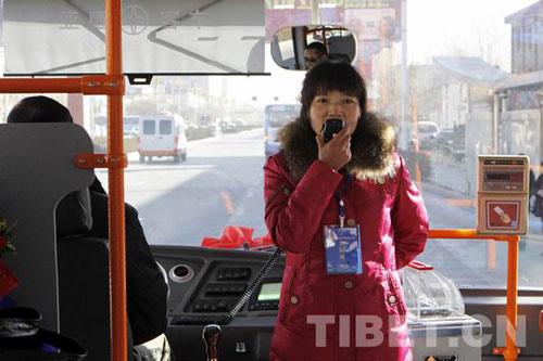 “各位乘客,我們的公交車已經(jīng)駛出了拉薩火車站廣場(chǎng)站。本車途徑柳梧大橋,江蘇路,康昂東路,請(qǐng)各位乘客扶好坐好,注意安全,對(duì)我們的服務(wù)提出寶貴意見(jiàn),謝謝!”隨著乘務(wù)員倉(cāng)啦清晰地藏漢雙語(yǔ)報(bào)站,拉薩市第一輛新公交車從火車站緩緩駛出,拉薩市232輛嶄新的公交車于12月19日正式投放運(yùn)營(yíng)。