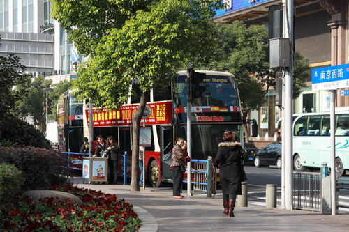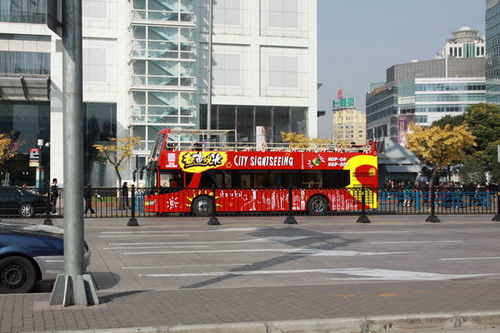 人民廣場(chǎng)是該旅游公司一個(gè)停靠點(diǎn),有兩位工作人員現(xiàn)場(chǎng)售票,內(nèi)賓100元,外賓160元一張票,上車后可以沿途游覽三十多個(gè)景點(diǎn),工作人員告訴我,旺季生意還是不錯(cuò)的,但目前是旅游淡季,國內(nèi)游客少點(diǎn),主要是外賓,正說著,有兩位大媽過來詢問憑老年證是不是可以免費(fèi)乘車,回答當(dāng)然是否定的,國家老年人的福利還沒有顧及到這個(gè)方面。