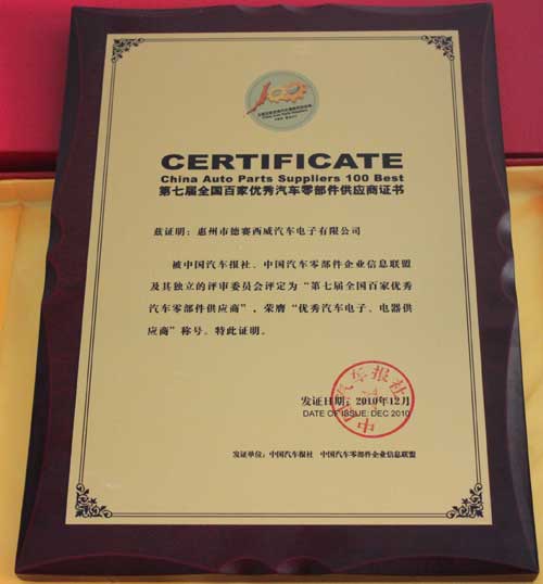 2010年12月2日,國內(nèi)權(quán)威汽車媒體中國汽車報社舉辦的"第七屆全國百家優(yōu)秀汽車零部件供應商"頒獎典禮在北京隆重舉行,專注于提供全球領(lǐng)先的汽車電子整體解決方案的德賽西威汽車電子進入該榜單。