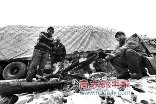 1月4日,湖南省境內(nèi)319國道懷化段通行受阻,受困車輛司機就地生火取暖。
